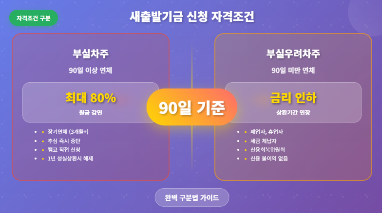 부실차주와 부실우려차주의 구분은 새출발기금 혜택을 결정하는 핵심 요소입니다. 90일이라는 기준점을 명확히 이해하고, 본인의 상황을 정확히 파악하는 것이 성공적인 채무조정의 첫걸음입니다.
