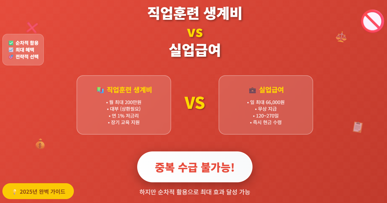 직업훈련 생계비와 실업급여는 중복 수급이 불가능하지만, 각각의 장점을 활용한 순차적 전략으로 더 큰 혜택을 얻을 수 있습니다.