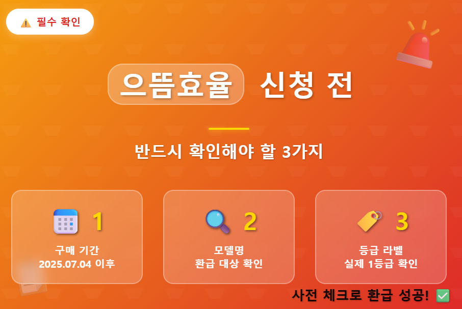 으뜸효율 환급사업은 2025년 7월 4일 제2차 추가경정예산 통과 직후부터 적용됩니다. 그 이전 구매 제품은 절대 환급 대상이 아닙니다.
