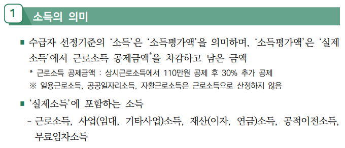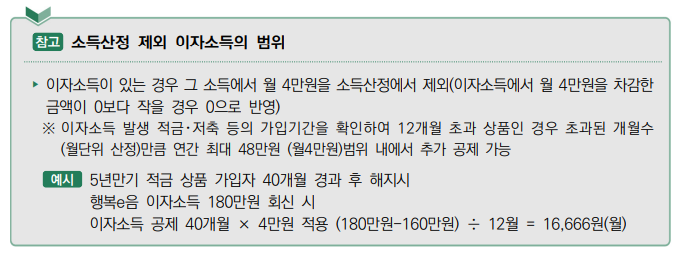 - 장애인 연금, 국가보훈 수당 등은 소득 산정에서 제외