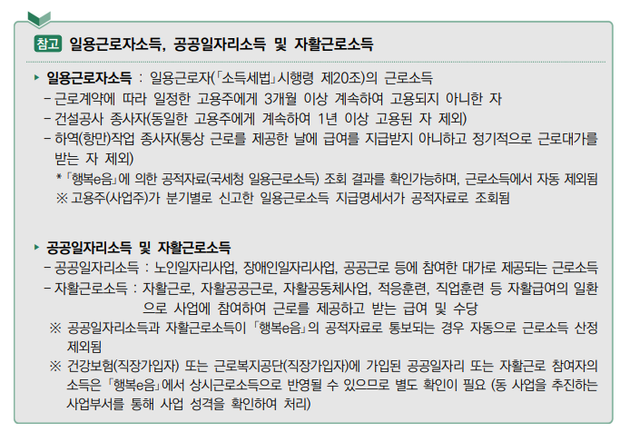 - 국민기초생활보장 생계급여, 주거급여 등은 제외 처리