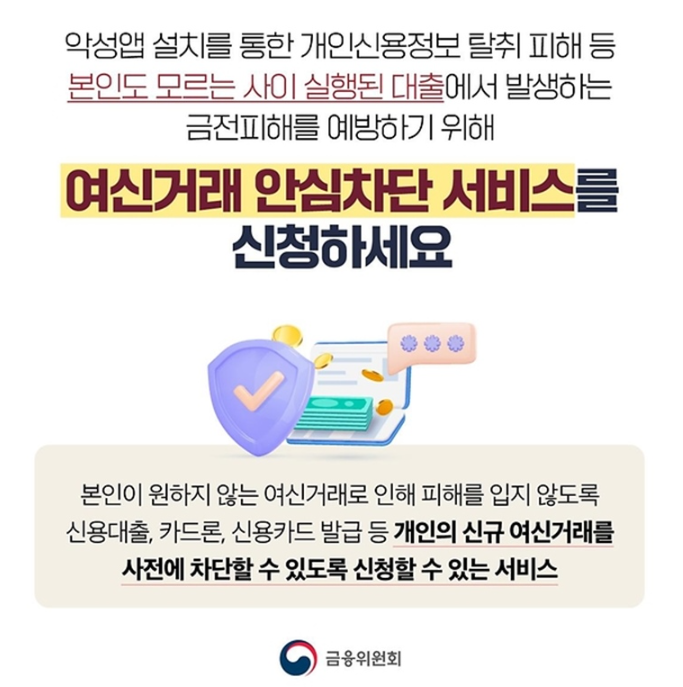 금융권에서 대출, 카드 발급 등 신규 여신거래를 사전에 차단해 금융사기 및 보이스피싱 피해를 예방하는 정부 지원 서비스입니다.