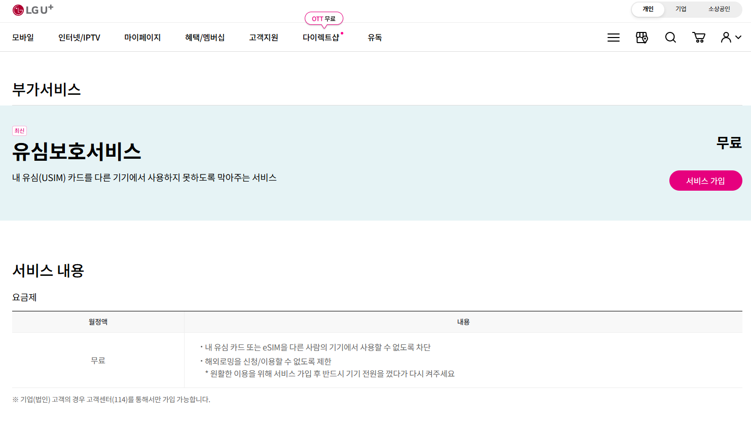 다른 기기에서 유심을 무단으로 사용할 수 없도록 유심 변경을 차단하고, 이상 징후 발생 시 자동 차단하는 통신사 제공 보안 서비스입니다.