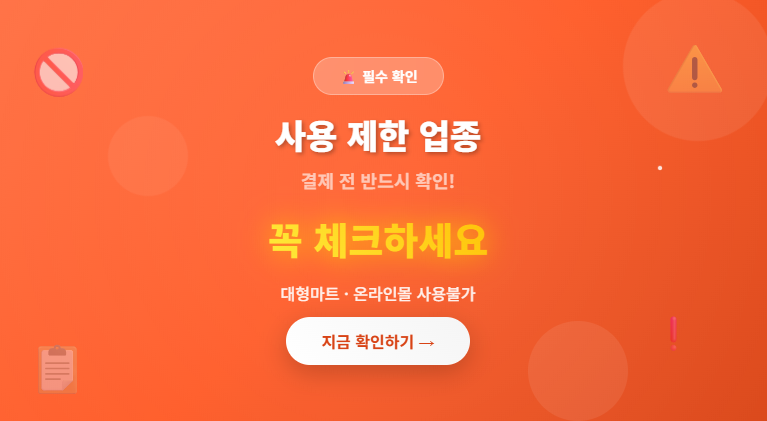 ⚠️ 중요 알림: 민생회복 소비쿠폰을 받았다고 모든 곳에서 사용할 수 있는 건 아닙니다! 소상공인 지원이 목적인 만큼 대형매장이나 특정 업종에서는 사용할 수 없어요. 결제 전에 꼭 확인하지 않으면 당황할 수 있으니, 사용 제한 업종을 미리 알아두세요.