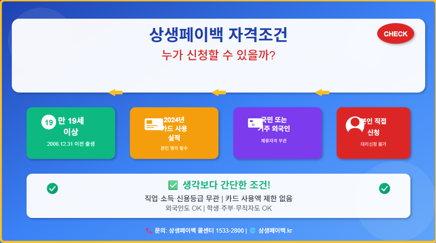 상생페이백의 자격 조건은 생각보다 간단합니다. 복잡해 보이지만 핵심은 만 19세 이상이면서 2024년에 본인 명의 카드를 사용한 기록만 있으면 됩니다.