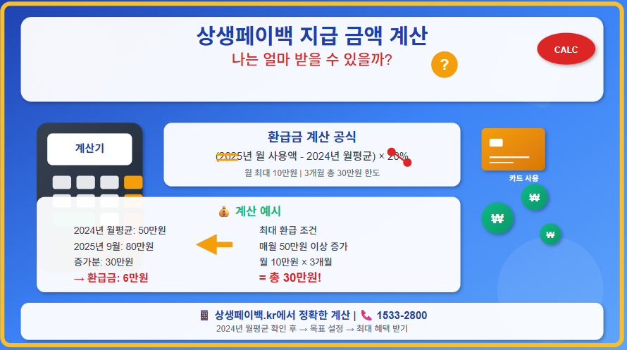 상생페이백 환급금 계산은 복잡해 보이지만 원리는 간단합니다. 작년보다 얼마나 더 썼느냐가 전부입니다.