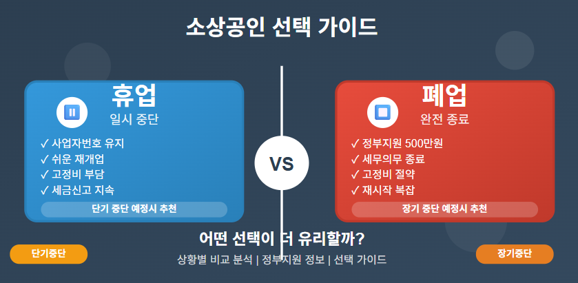 소상공인의 폐업 vs 휴업 선택은 단순히 경제적 손익만으로 결정할 문제가 아닙니다. 재개업 가능성, 현재 재정 상황, 미래 계획 등을 종합적으로 고려해야 합니다.