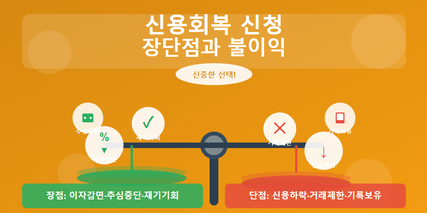 채무 상환이 어려워 신용회복을 고민하고 계신가요? 신청하기 전에 반드시 장점과 단점을 정확히 알아야 합니다. 신용회복은 분명 많은 도움이 되지만, 동시에 일정 기간 불이익도 따릅니다. 이 글에서는 신용회복의 명확한 장단점과 각 절차별 불이익, 그리고 불이익을 최소화하는 전략까지 솔직하게 알려드립니다.