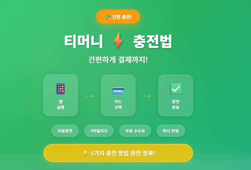 - 타 카드사 이용자: 모바일티머니 앱 + 카드/계좌 (다양한 선택)
