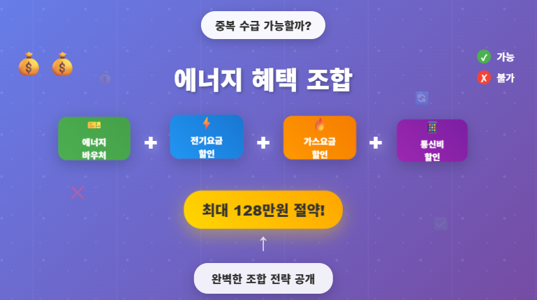 에너지바우처는 대부분의 다른 에너지 지원제도와 중복 수급이 가능합니다. 핵심은 어떤 제도들이 함께 받을 수 있는지 정확히 파악하는 것입니다. 동절기 연료비 지원 제도들만 중복이 안 될 뿐, 전기·가스 요금 할인, 통신비 할인 등은 모두 함께 받을 수 있습니다.