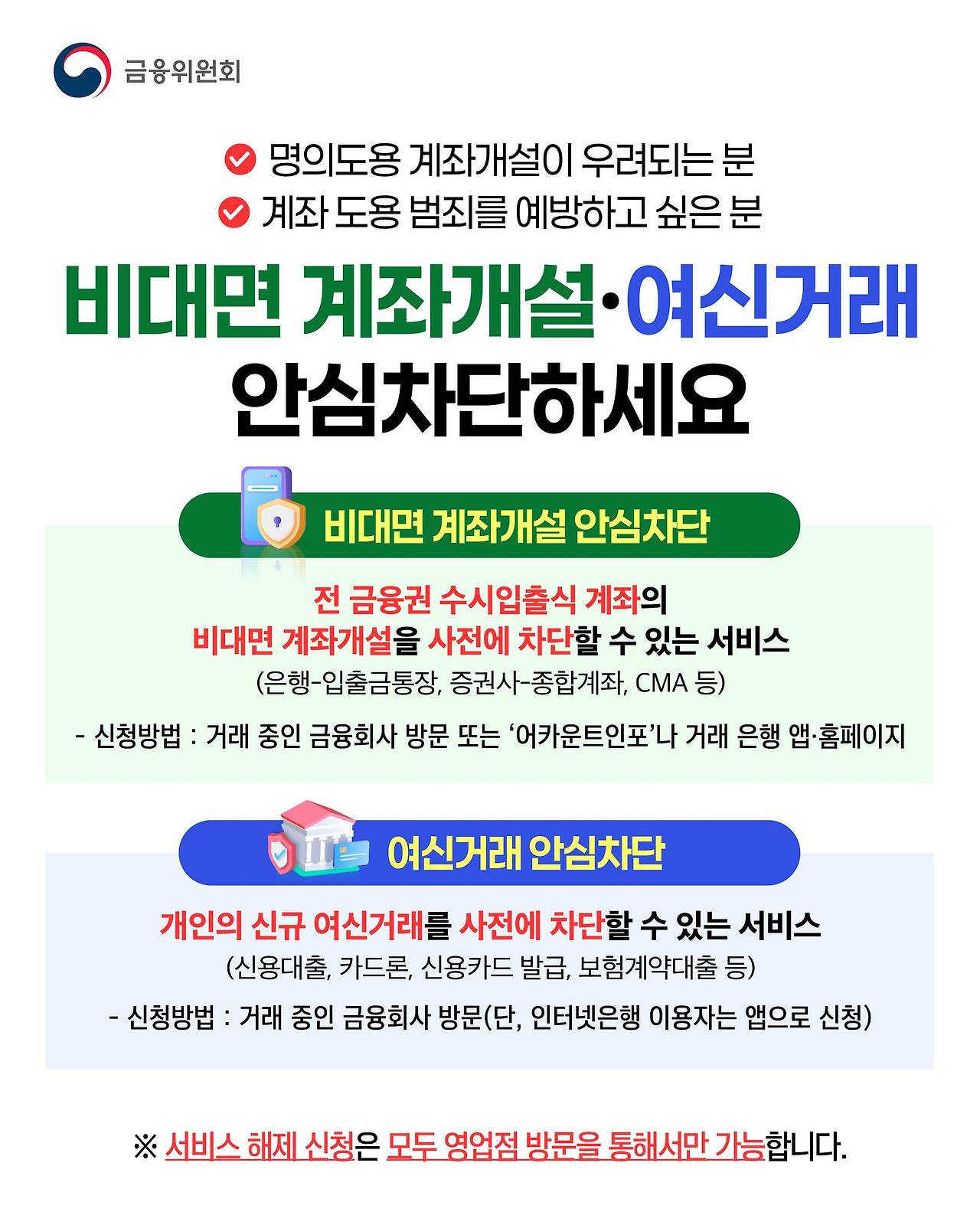 - 해제: 대출이나 신용카드 발급이 필요할 경우, 금융기관 영업점을 방문하여 본인 확인 후 차단을 해제할 수 있습니다.