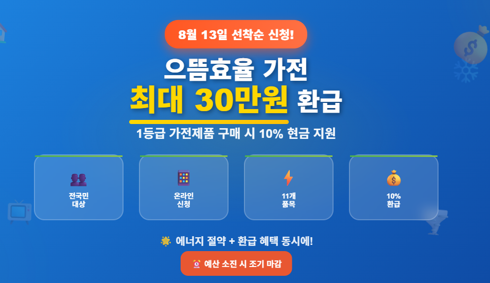 예산이 한정되어 있고 선착순으로 진행되기 때문에, 8월 13일 오전 10시에는 꼭 사이트에 접속하여 신청하시길 바랍니다. 가전제품 교체를 계획하고 계셨다면 이번 기회를 놓치지 마세요!