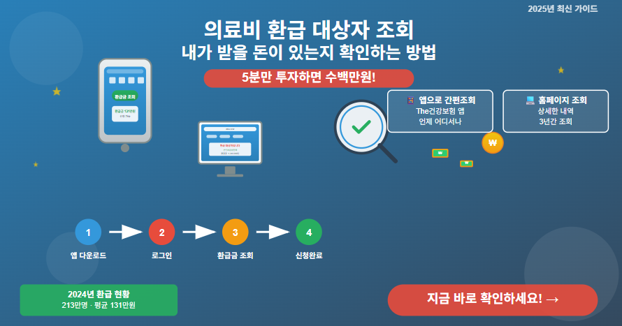 혹시 작년에 병원비를 많이 쓰셨나요? 아니면 건강보험료를 이중으로 납부한 적이 있으신가요? 그렇다면 지금 당장 조회해보세요. 생각보다 많은 분들이 자신도 모르게 환급 대상자가 되어있답니다.