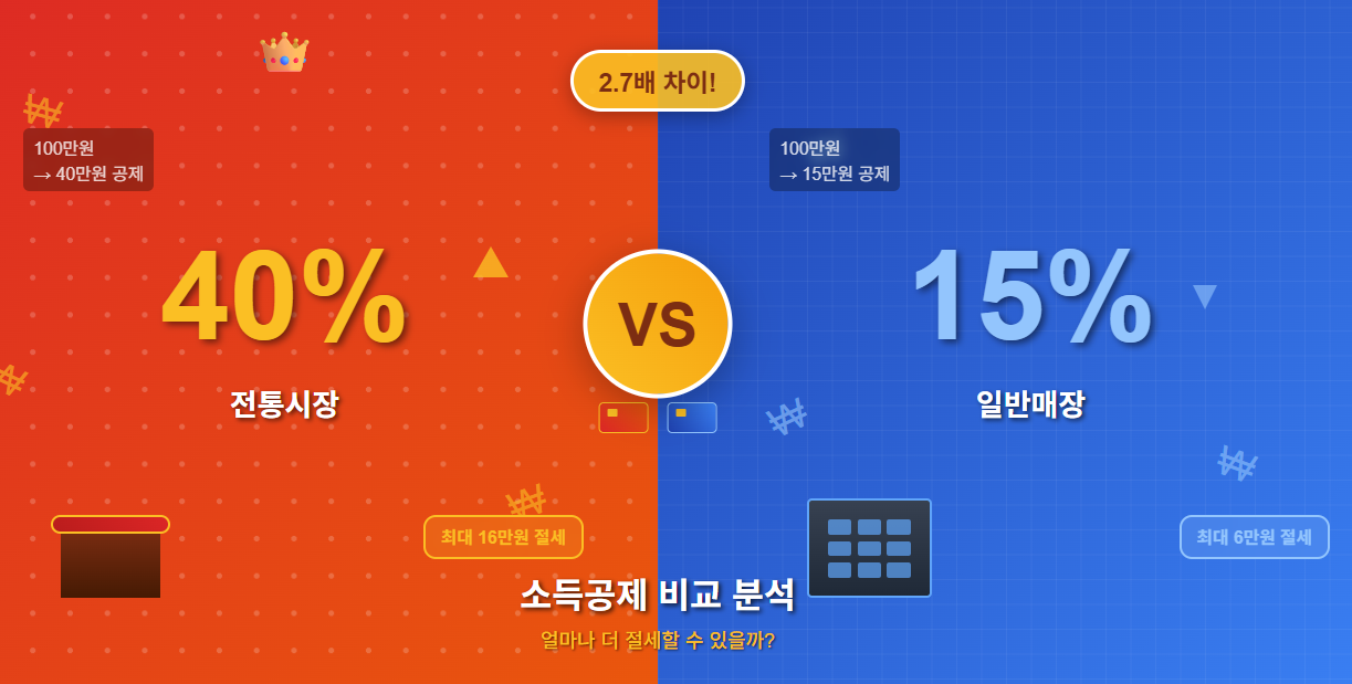 같은 금액을 사용해도 전통시장에서는 40%, 일반 매장에서는 15%만 공제됩니다. 이는 2.7배의 차이로, 연간 수십만원의 세금 차이를 만들어냅니다.