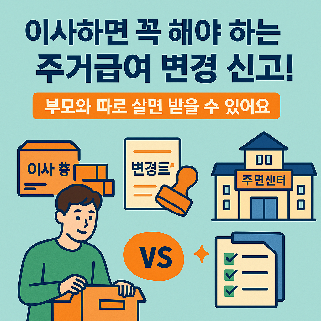 주거급여 수급자가 이사를 하게 되면 반드시 주소 변경 신고와 함께 주거급여 변경 신청을 해야 합니다. 변경 신고를 하지 않으면 급여가 중단되거나 환수될 수 있어 꼭 체크해야 할 중요한 절차입니다.