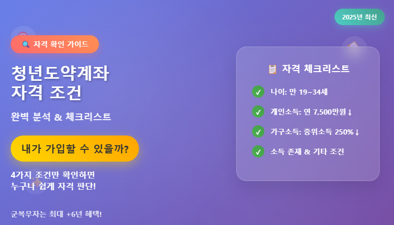 이 글에서는 2025년 기준 청년도약계좌 자격 조건을 쉽게 설명하고, 여러분이 바로 확인할 수 있는 체크리스트도 제공해드릴게요!