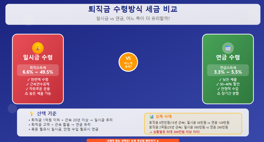 퇴직금을 어떻게 받느냐에 따라 세금 부담이 크게 달라집니다. 일시금은 퇴직소득세(최저 6.6%~최고 49.5%), 연금은 연금소득세(3.3%~5.5%) 또는 종합소득세가 적용됩니다. 퇴직금액과 근속연수에 따라 유리한 선택이 달라지므로 정확한 계산이 필수입니다.