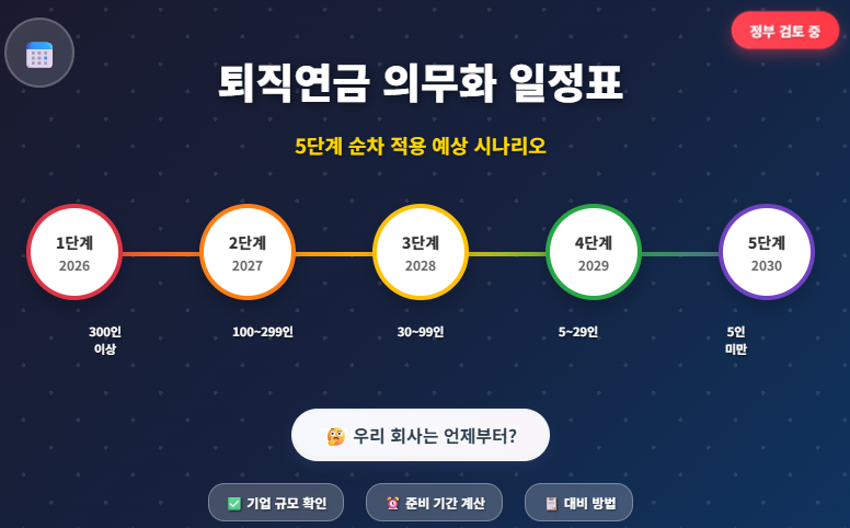 퇴직연금 의무화는 현재 정부 검토 단계이며, 구체적인 시행 일정은 아직 확정되지 않았습니다. 본 글은 고용노동부가 국정기획위에 보고한 검토안을 바탕으로 작성된 예상 시나리오입니다.