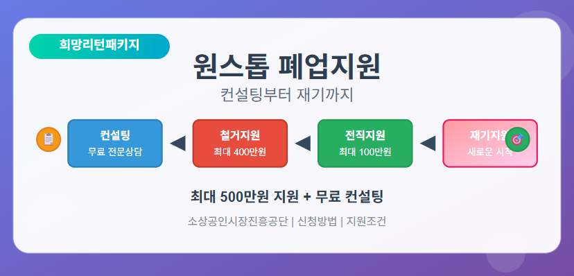 희망리턴패키지는 단순한 폐업 지원을 넘어서 소상공인의 새로운 도전을 응원하는 종합 지원 시스템입니다. 어려운 상황에서도 체계적이고 전문적인 도움을 통해 더 나은 미래를 준비할 수 있습니다.