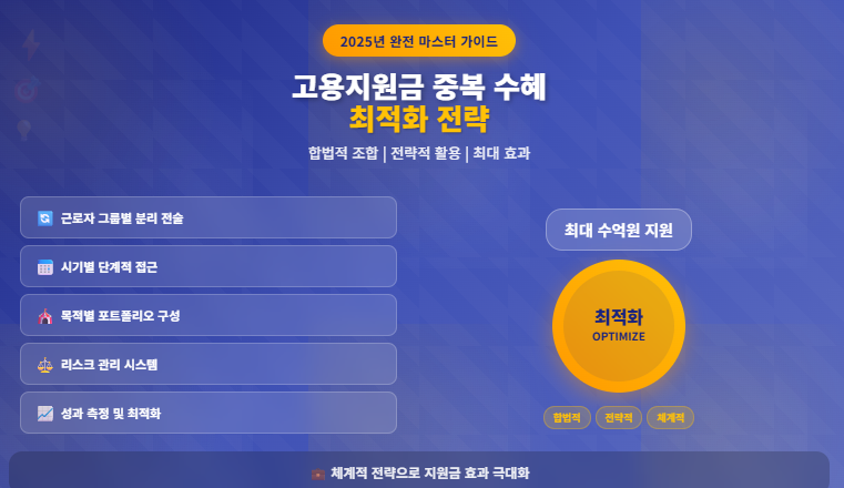 고용지원금을 전략적으로 조합하면 연간 수억원까지 지원받을 수 있습니다. 하지만 무작정 신청하면 중복 제한에 걸려 아무것도 받지 못할 수 있습니다. 이 가이드로 합법적이고 효과적인 중복 수혜 전략을 완전 마스터하세요!