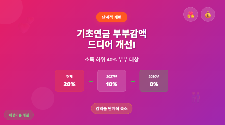 결혼한 부부라는 이유로 기초연금을 20%씩 깎여서 받으시던 어르신들, 이제 희망이 보입니다! 정부가 그동안 논란이 많았던 '기초연금 부부감액 제도'를 단계적으로 개선한다고 발표했거든요.
