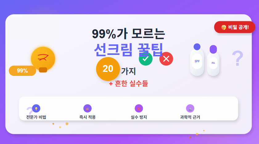 대부분 사람들이 선크림을 잘못 사용하고 있습니다. 피부과 전문의와 화장품 연구원들만 아는 진짜 꿀팁들을 공개합니다. 이 20가지만 알아도 선크림 효과가 2배는 달라집니다!
