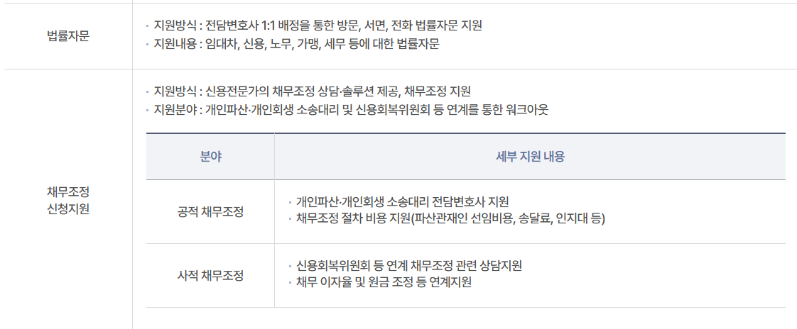 - 신용회복위원회 연계, 파산·회생 소송 비용 일부 지원