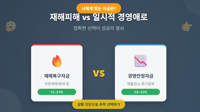 재해로 인한 피해와 일반적인 경영 어려움은 지원 조건부터 금리까지 모든 게 달라요. 내 상황을 정확히 파악하고 가장 유리한 지원을 받는 방법을 알려드릴게요!