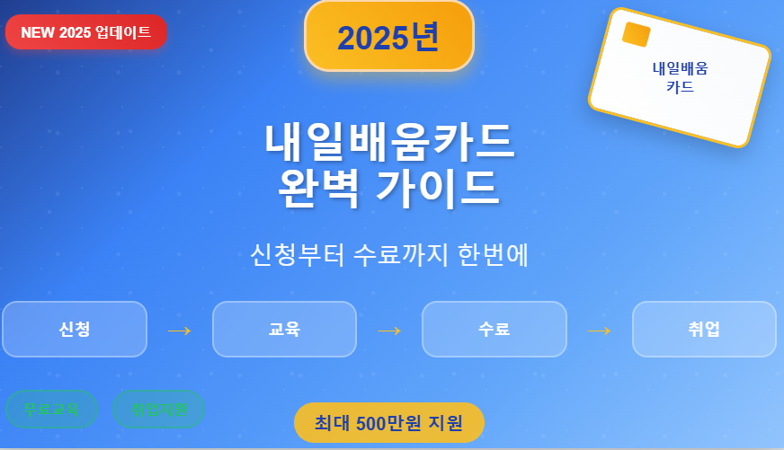 정부의 직업능력개발 지원제도인 내일배움카드가 2025년 새해와 함께 더욱 풍성한 혜택으로 여러분을 찾아갑니다. 5년간 최대 500만원 지원으로 원하는 직업교육을 받고, 꿈꾸던 커리어를 시작해보세요!