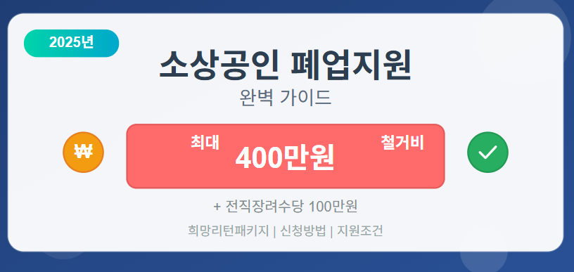 2025년 소상공인 폐업지원은 기존보다 150만원이 증액된 최대 400만원의 철거비를 지원하여 폐업 부담을 크게 덜어줍니다. 여기에 전직장려수당 100만원까지 합치면 총 최대 500만원의 지원을 받을 수 있습니다.
