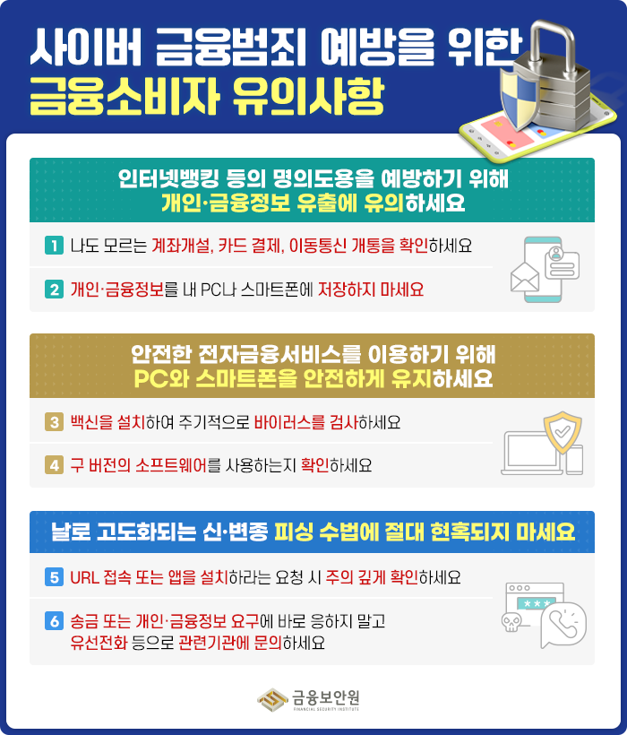 - 공식 앱 사용: 금융 회사의 공식 앱을 사용하고, 출처가 불분명한 앱은 설치하지 않습니다.