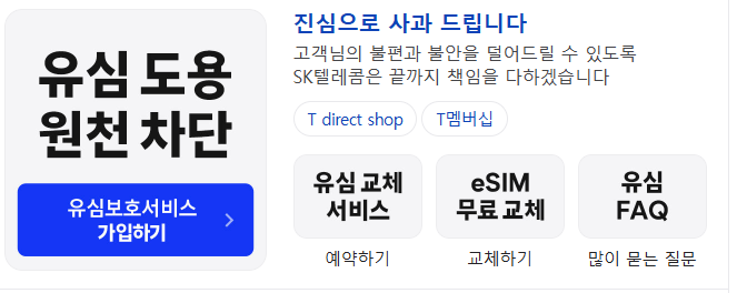 유심 보호 서비스는 유심이 무단으로 다른 기기에서 사용될 경우, 자동으로 통화/데이터/로밍 사용을 차단하여 악용을 막아주는 SKT의 보안 기능입니다.